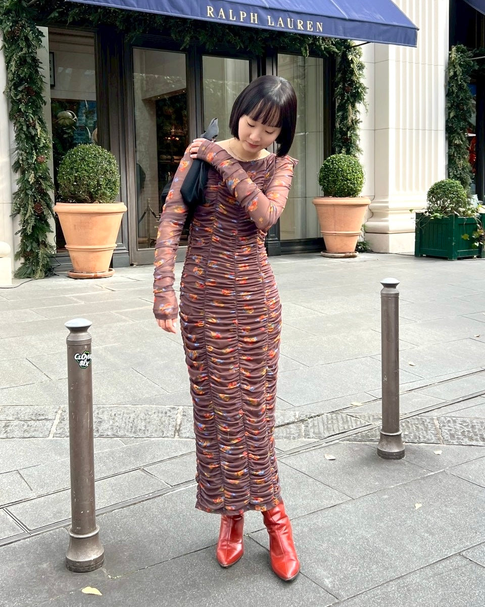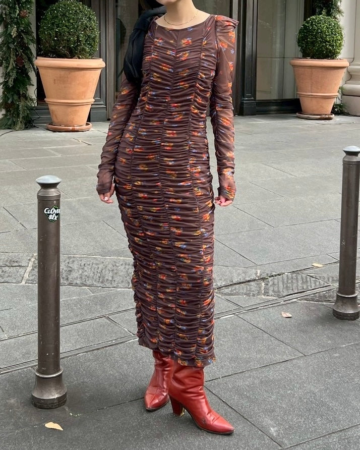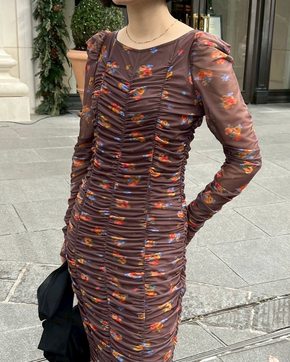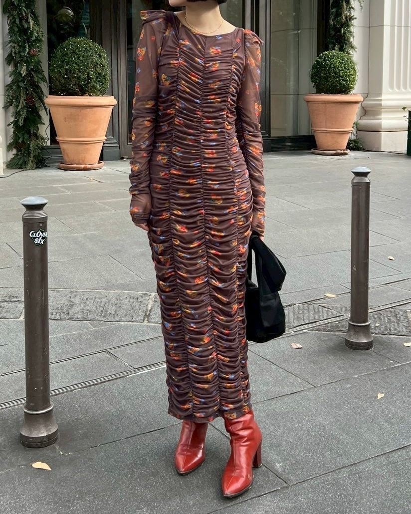 Brown bouquet gathered dress