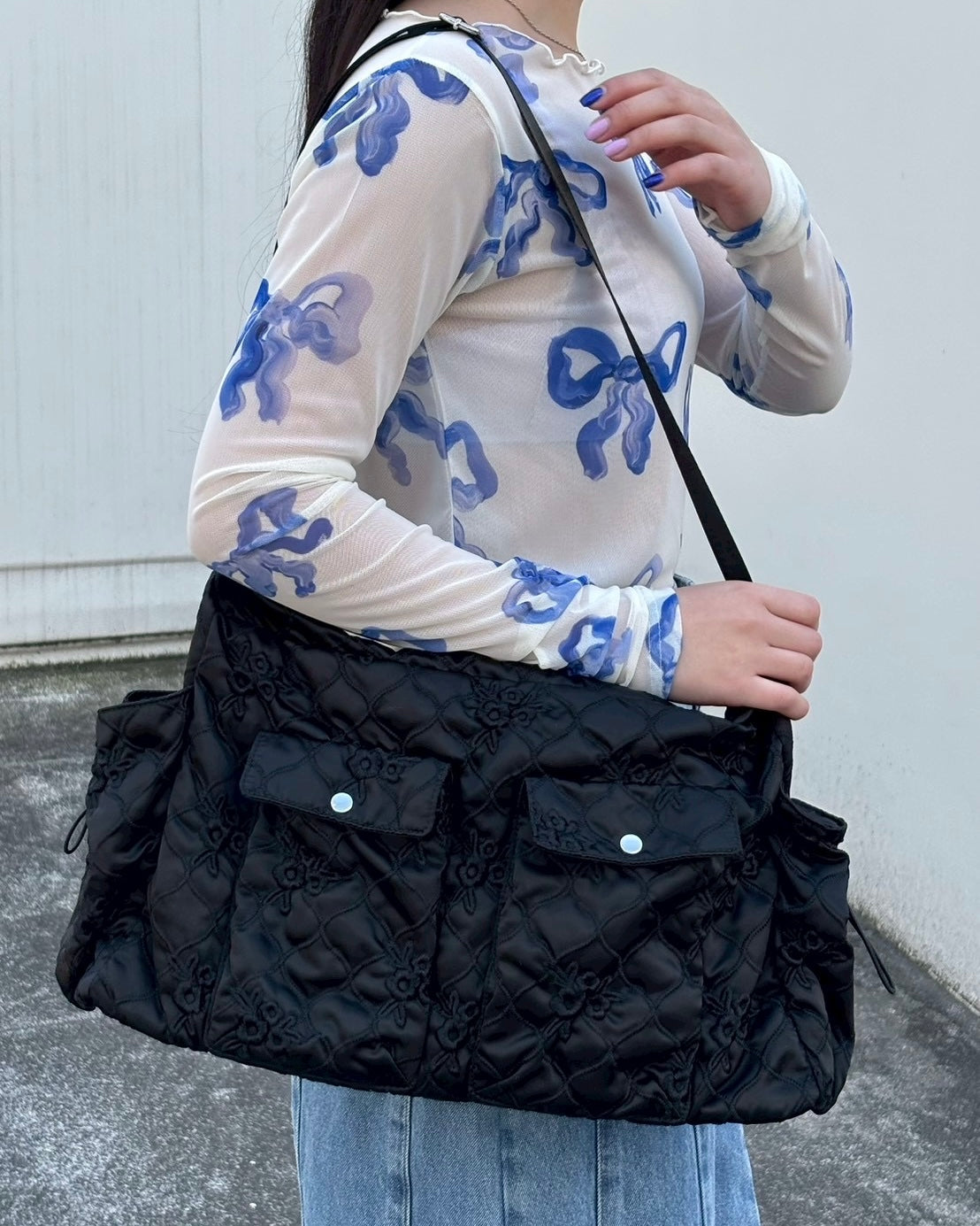 Flower quilted shoulder bag (black)