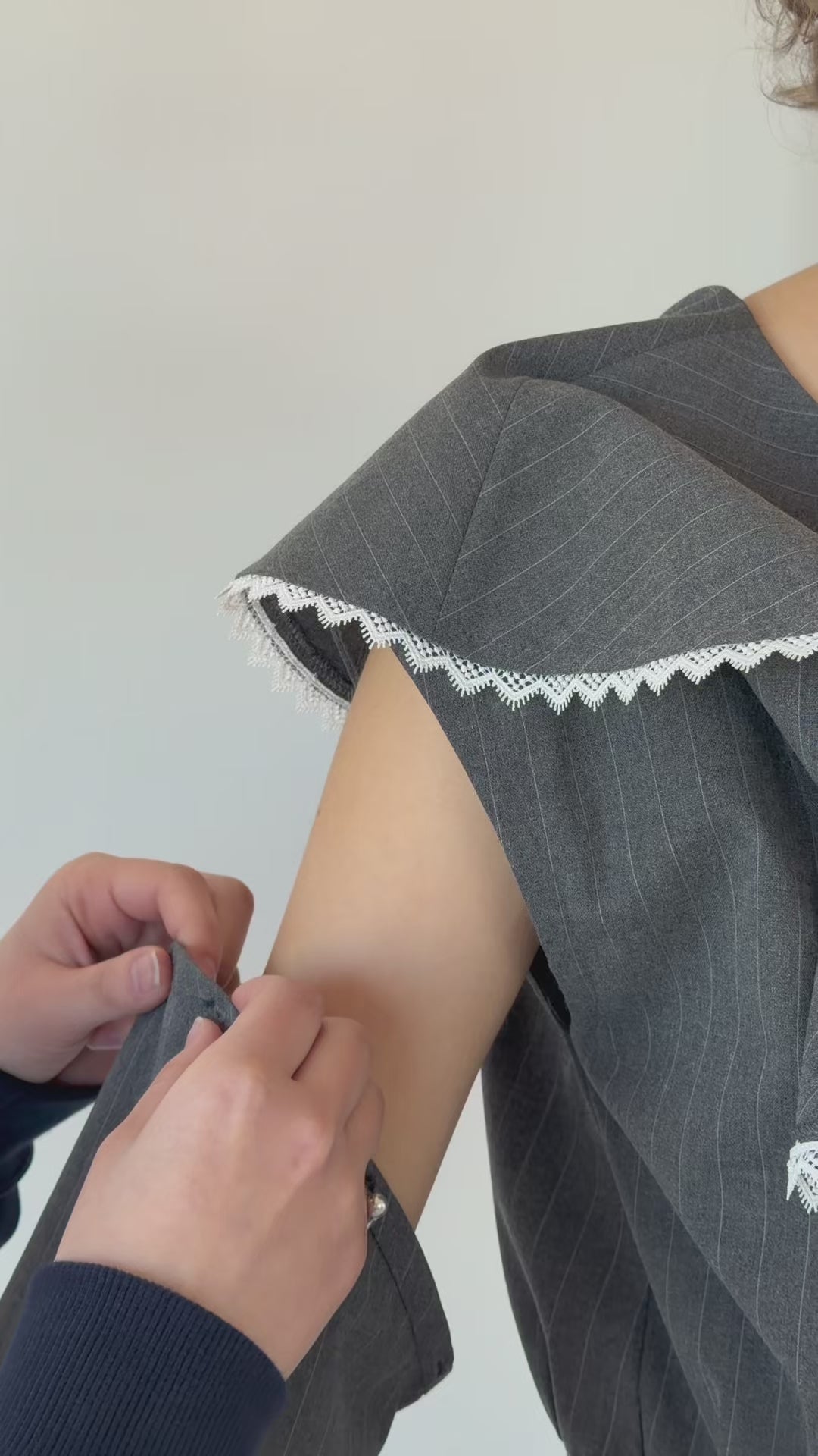 縁にあしらったトリムレースが、動きの中にクラシカルなニュアンスを添えます。