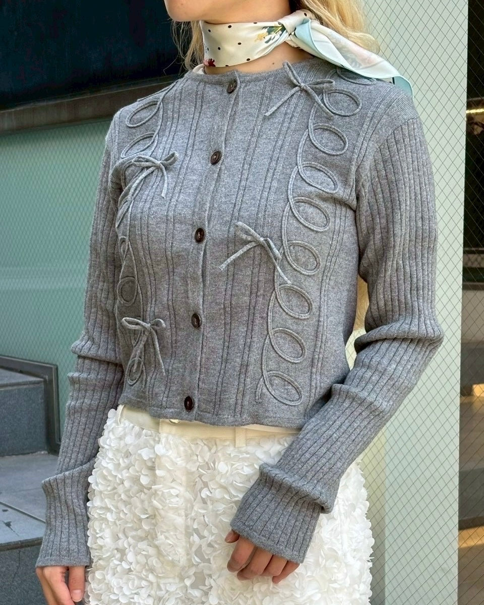 쿠루쿠루 리본 리브 니트 가디건(그레이)