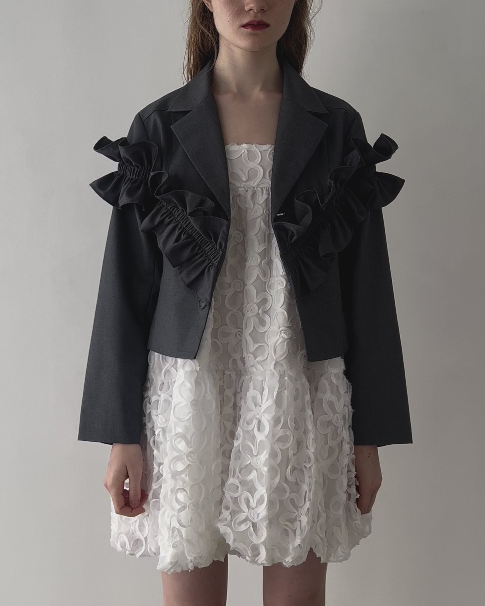 큰 프릴이있는 디자인 재킷은 시선과 개성을 향상 시켰습니다.