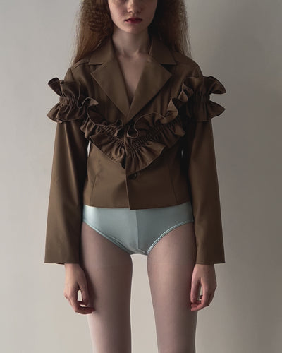 큰 프릴이있는 디자인 재킷은 시선과 개성을 향상 시켰습니다.