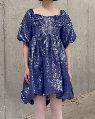 鮮やかなブルーと煌びやかなテキスタイルが目を惹くバルーンミニドレス。