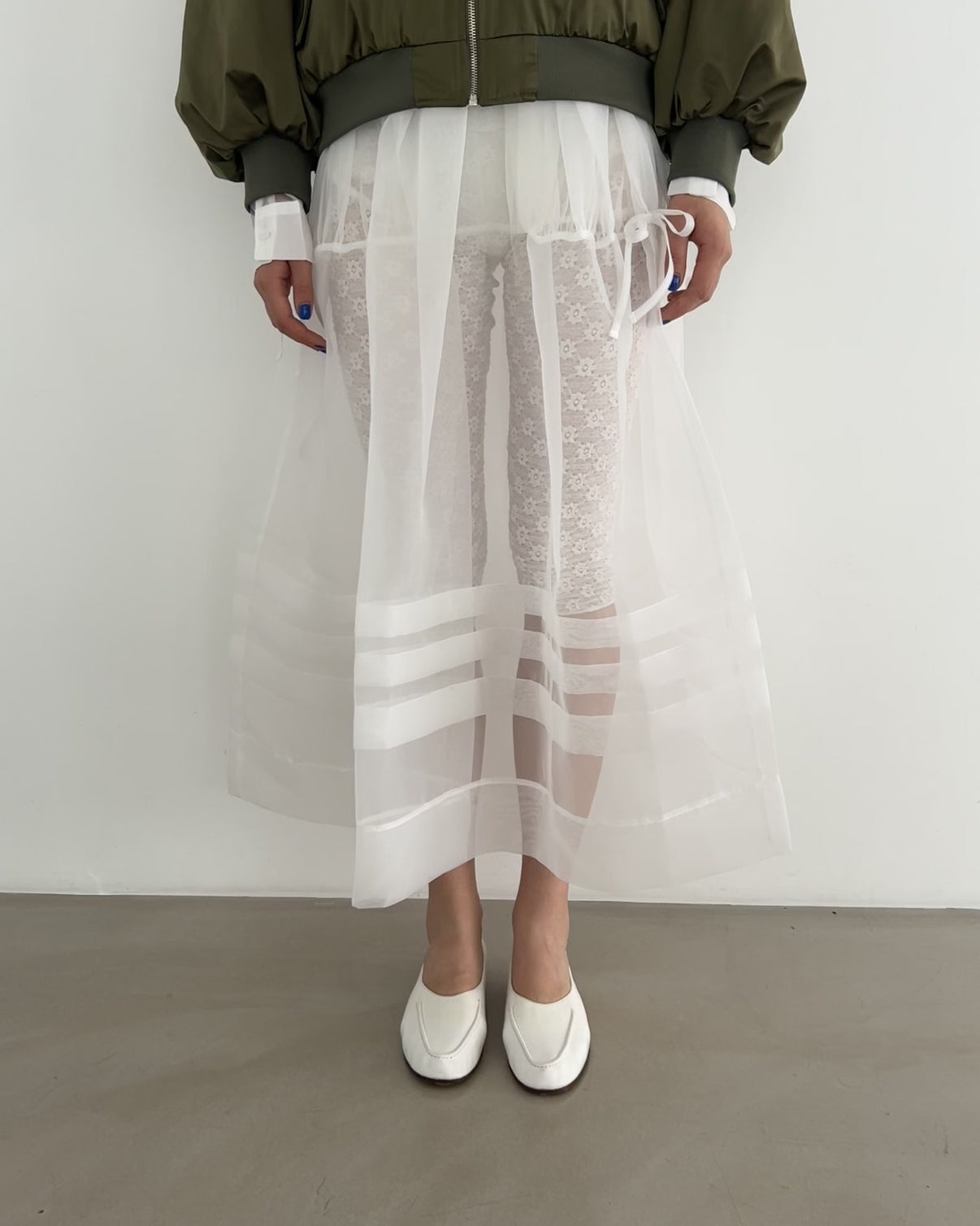 立体的に広がるふわりとしたシルエットが目を引くオーガンジースカート。