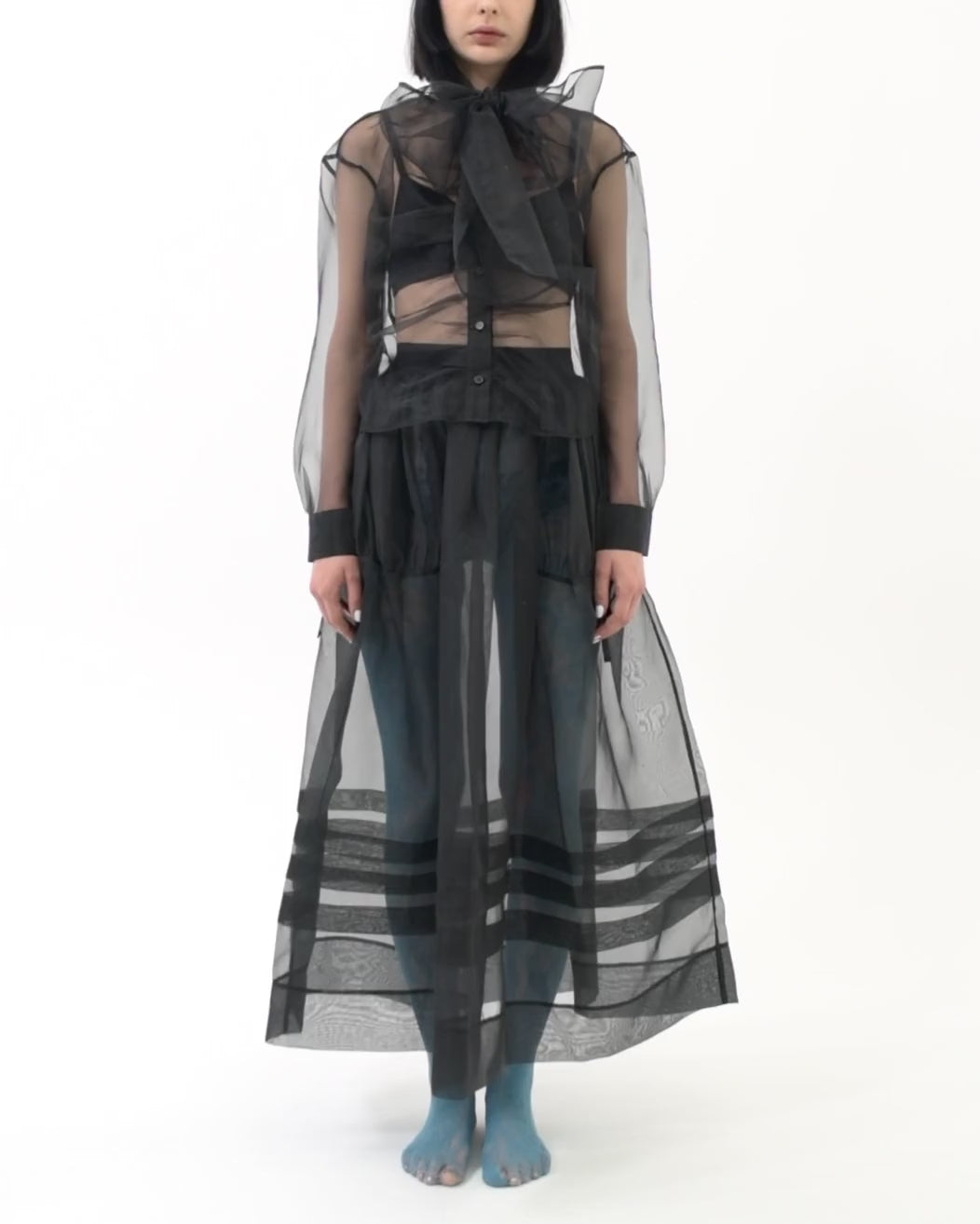 透け感と程よいハリ感が洗練された印象のオーガンジーリボンタイブラウス。