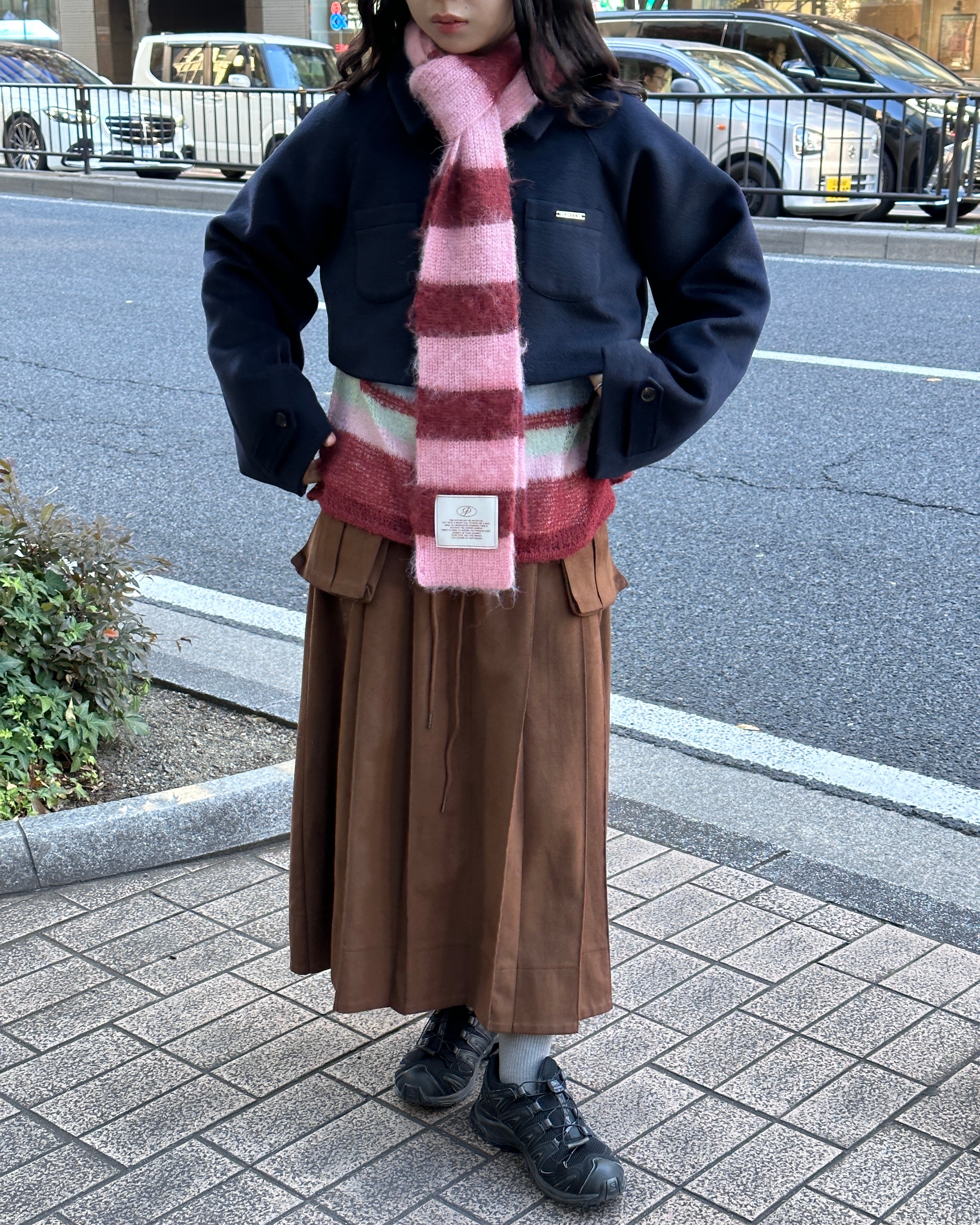 Suede-like pleated long skirt