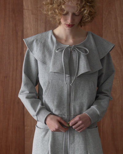 ラッフルカラーを主役に引き立てるため、身頃や袖はあえてコンパクトなバランスに。