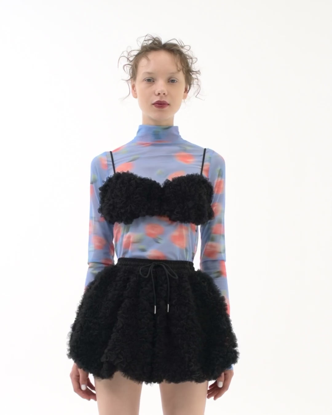 由三维薄纱织物制成的气球迷你裙是一件可爱的饰物,带有圆形轮廓。