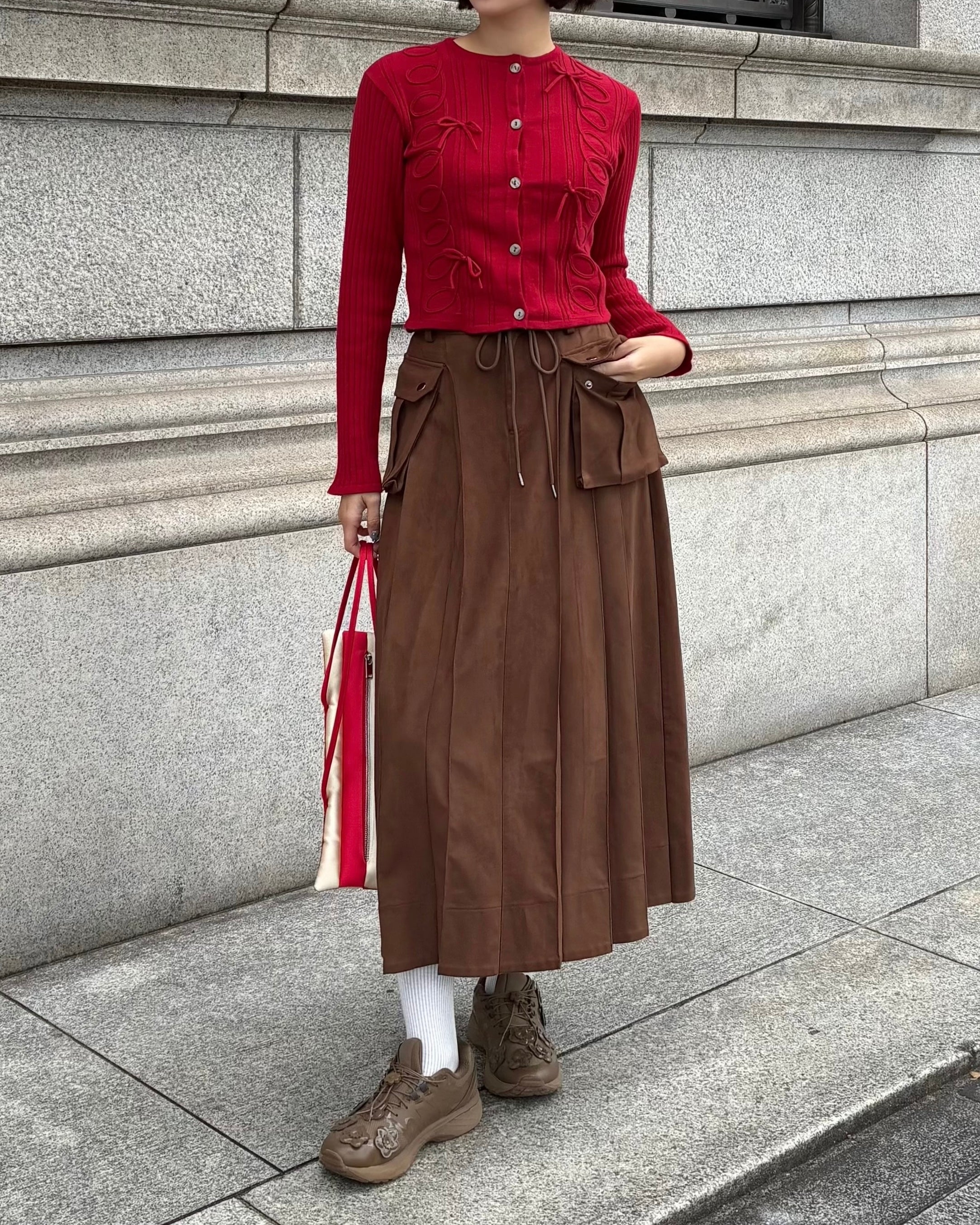 Suede-like pleated long skirt