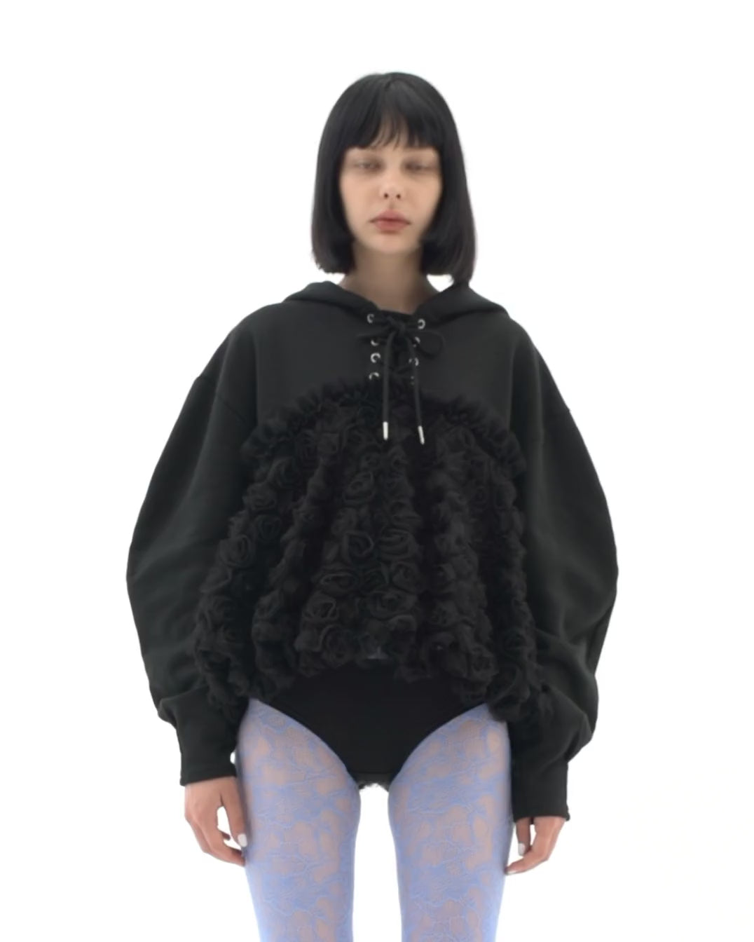 一個停靠的連帽衫,帶有薄紗織物,就像一朵盛開的花朵一樣。