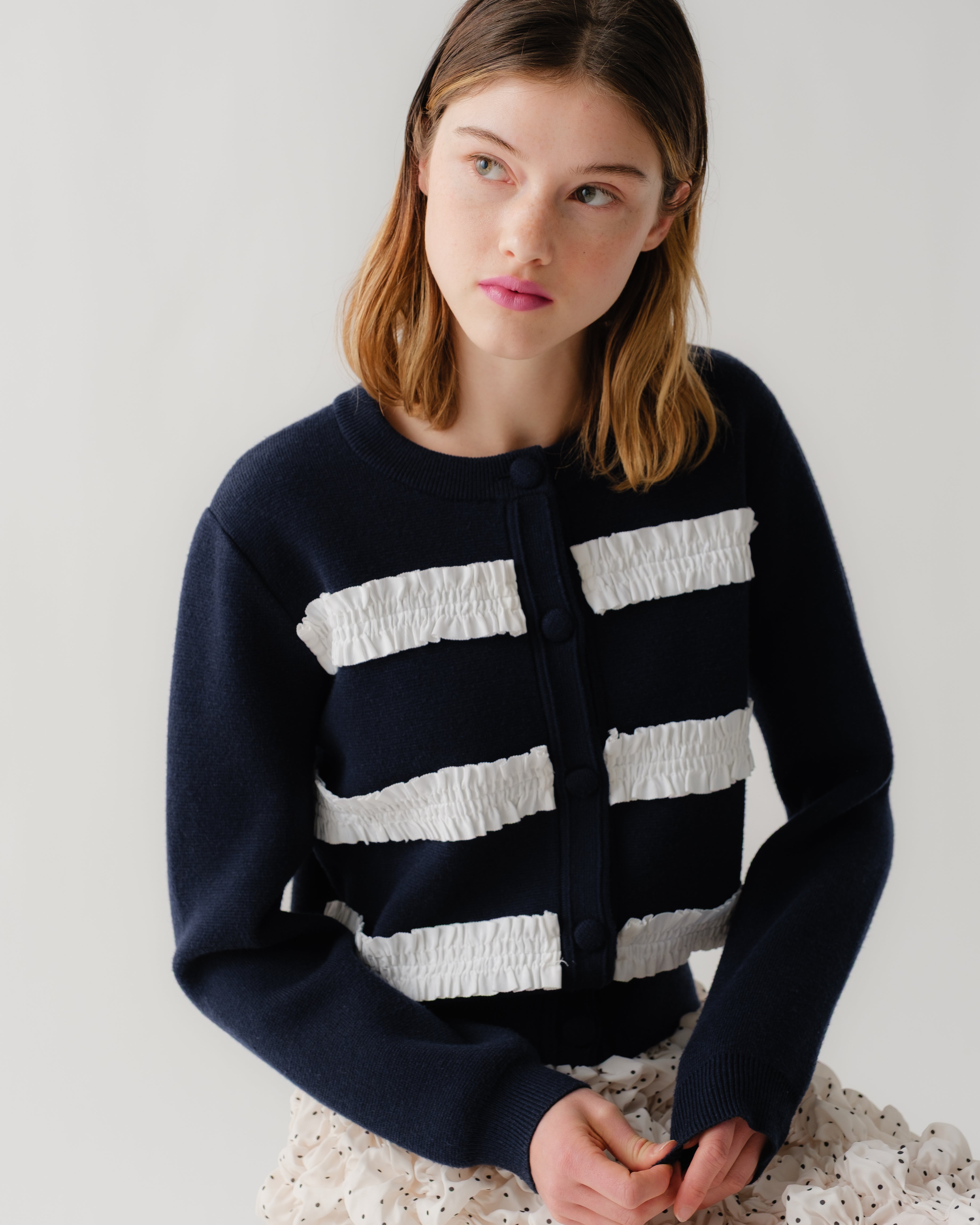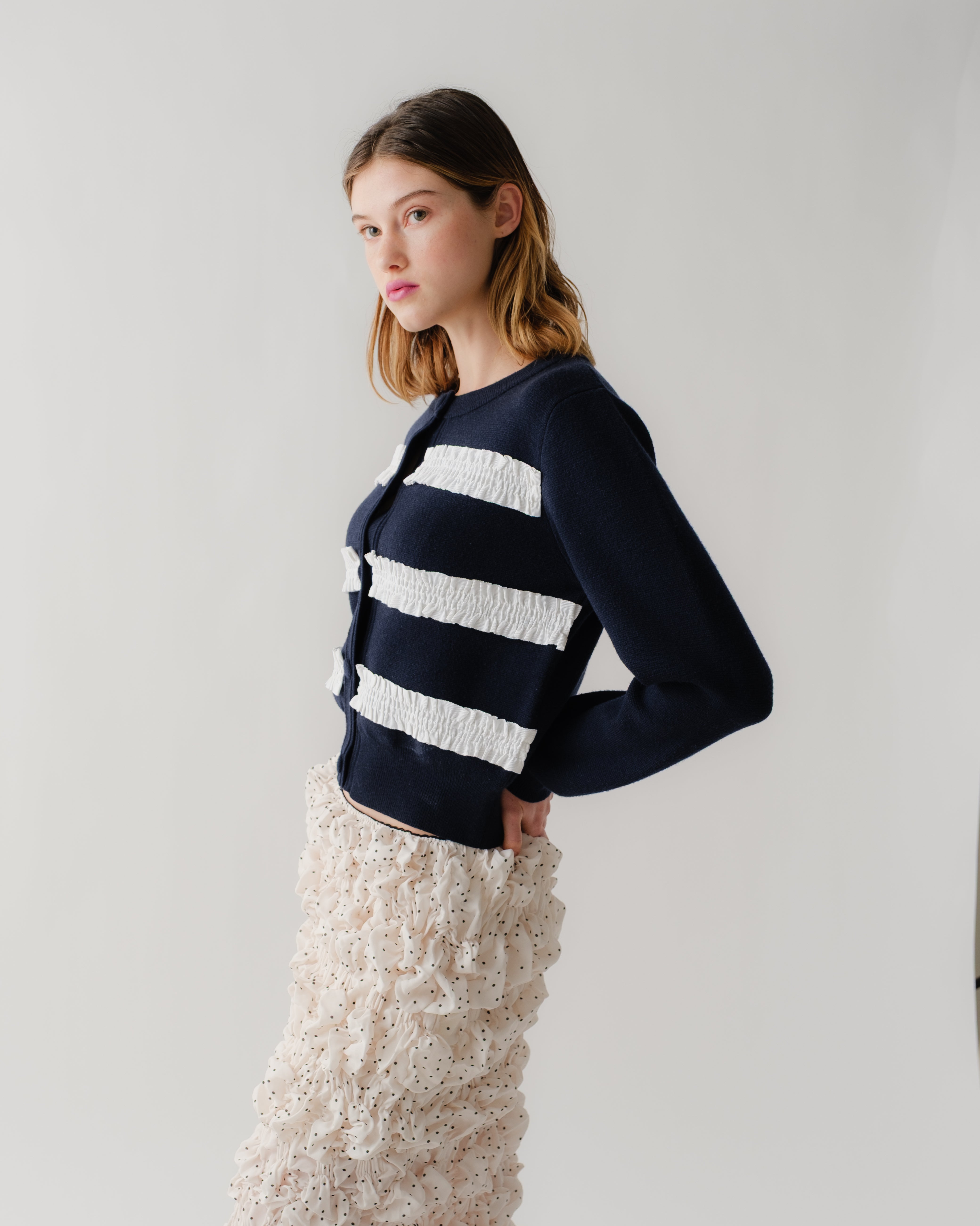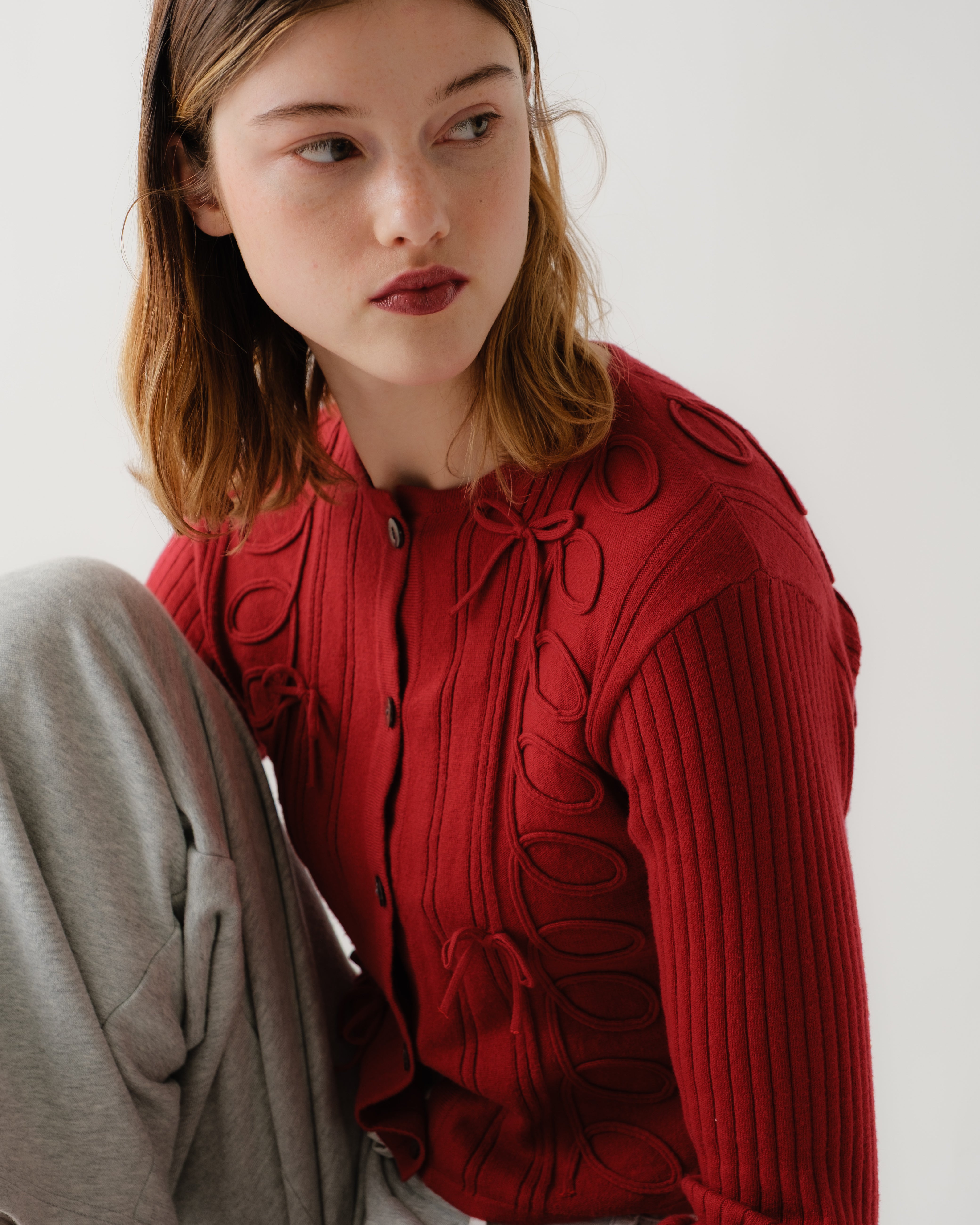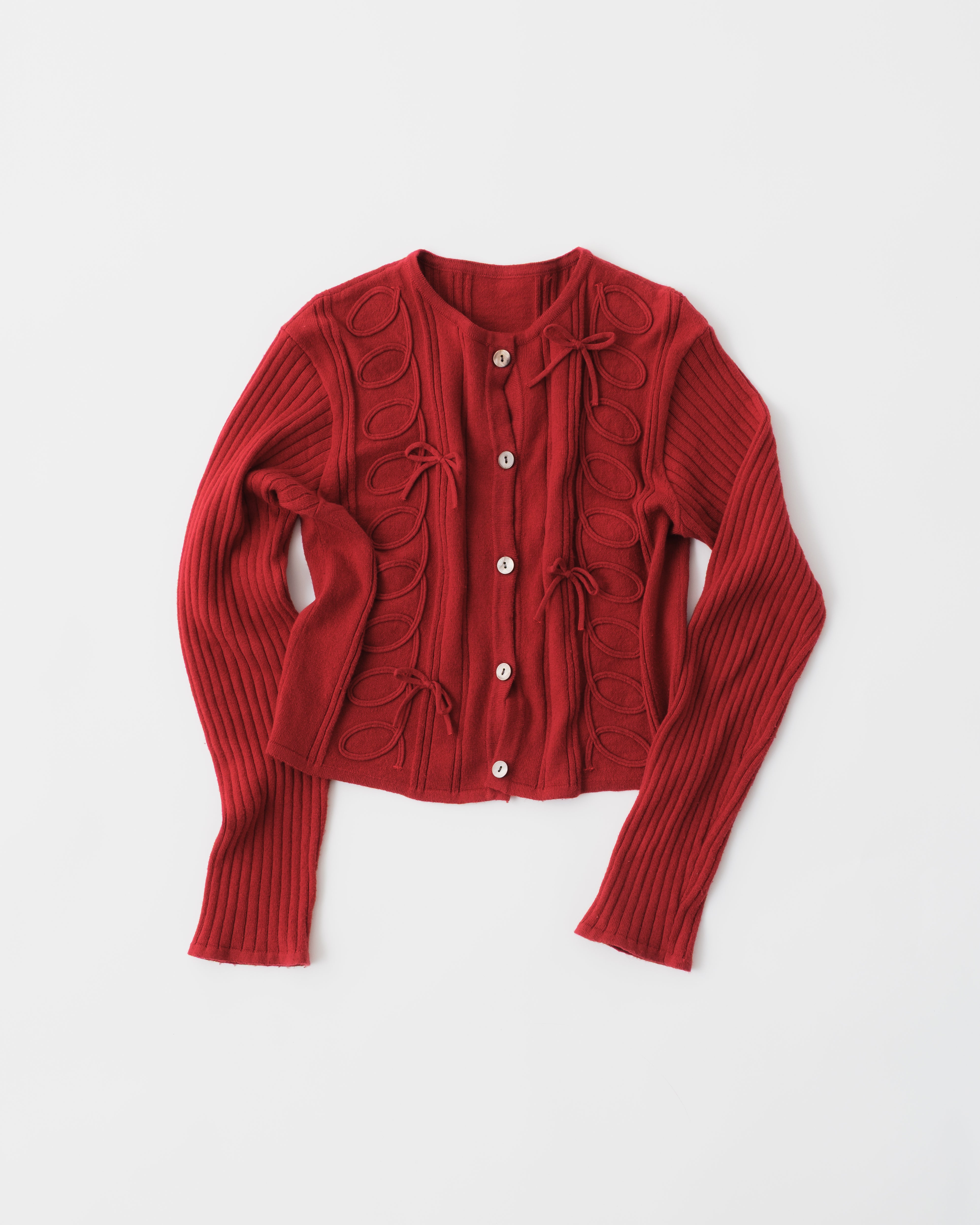 立体的なリボン、くるくるとしたラインがレトロでありながらも光沢感のあるブラウンのボタン、リブで仕立てた袖がモダンさを演出します。