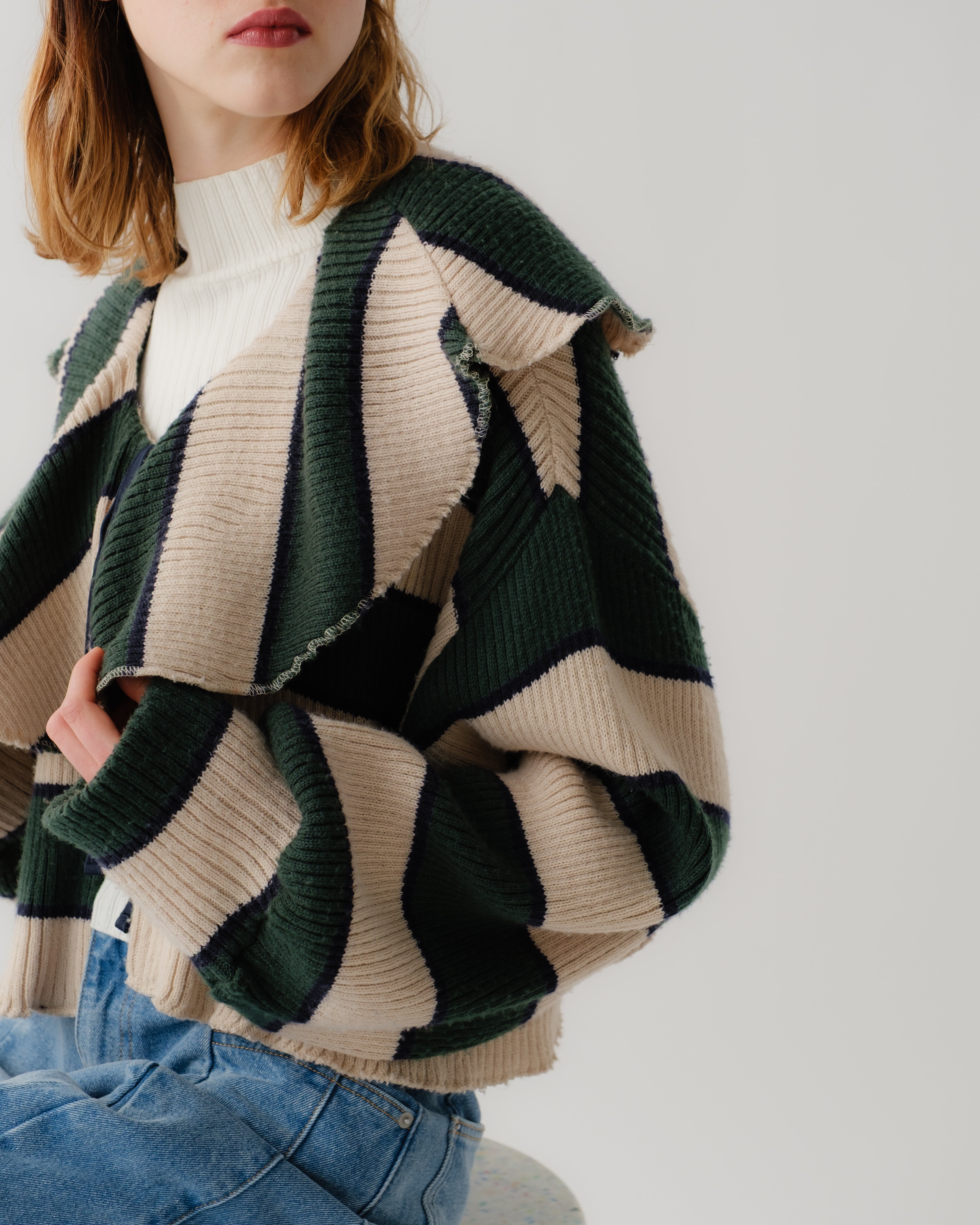 ニットの端にはくるんとした動きのある仕様を施し、ゆとりのあるシルエットが程よい抜け感を演出します。