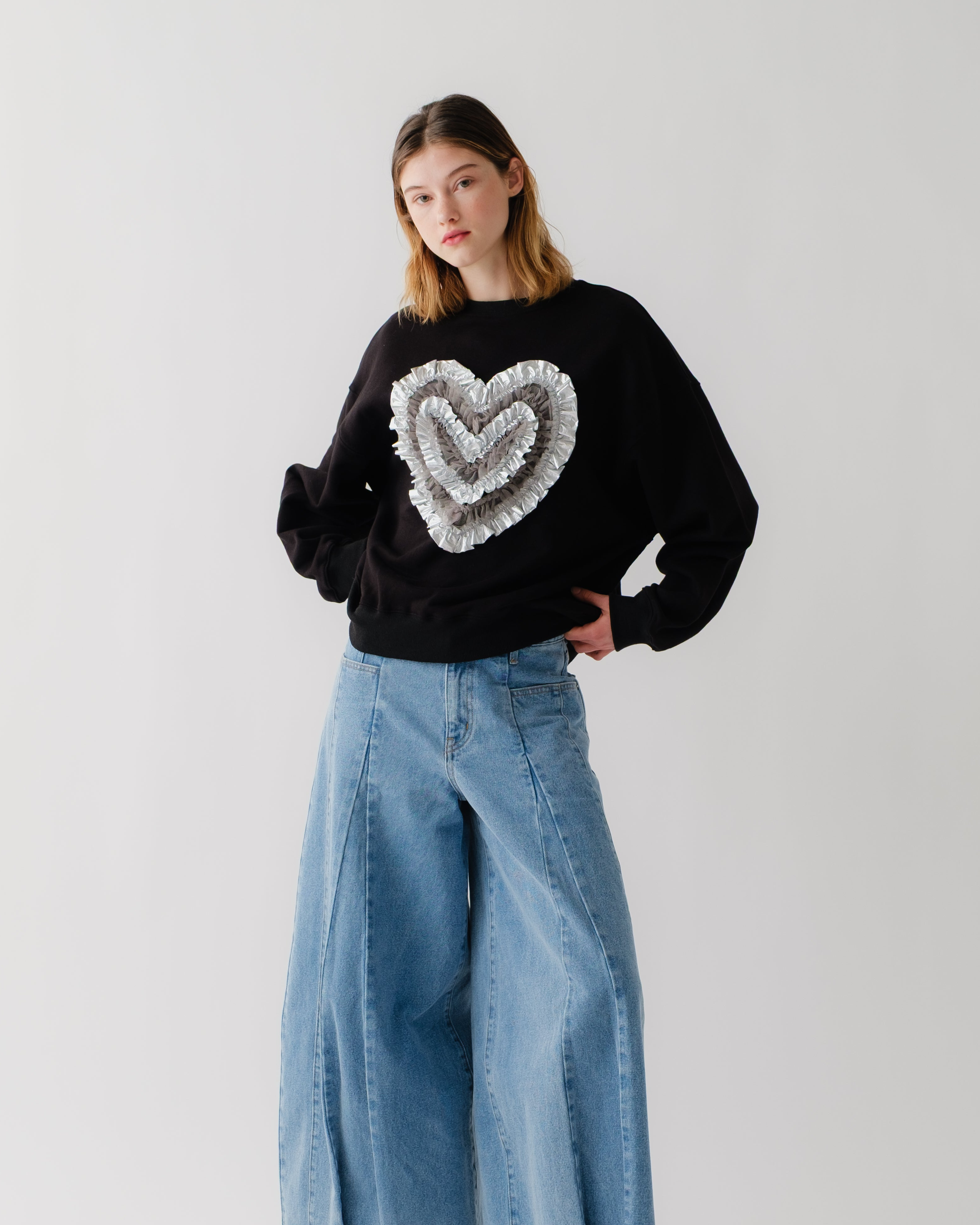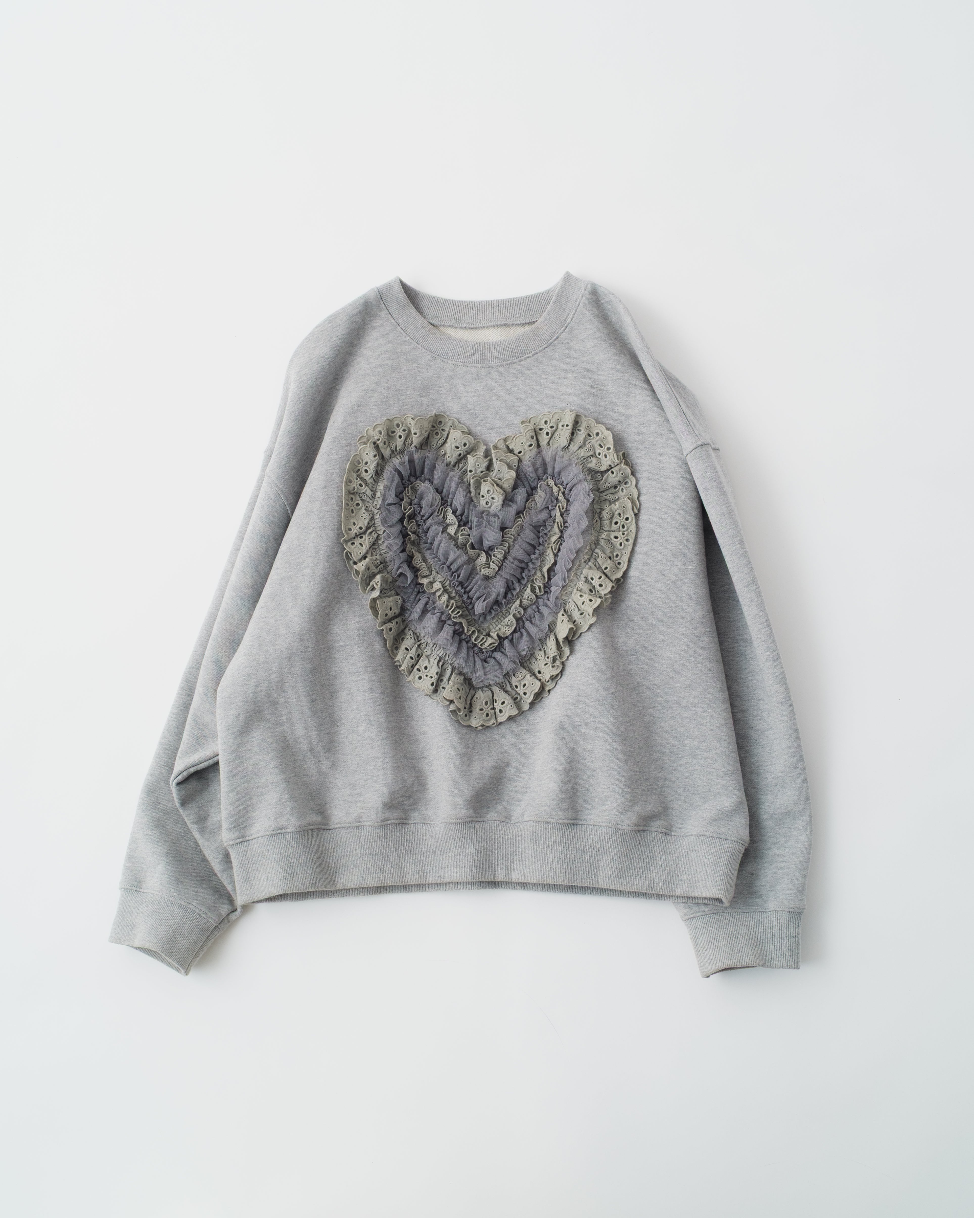 フリルで施した大きなハートがキャッチーなスウェットトップス。動きのあるギャザーフリルをふんだんに使い立体感を演出。