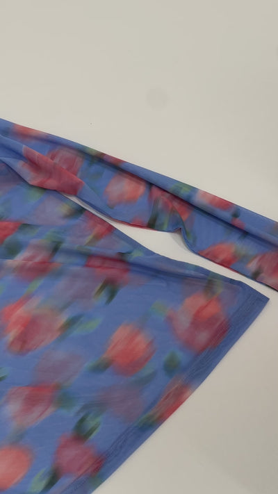 一塊浪漫的作品,空中有明亮的粉紅色花朵舞。粉紅色和背景紫色的組合在浪漫風格和流行風格之間形成了對比。